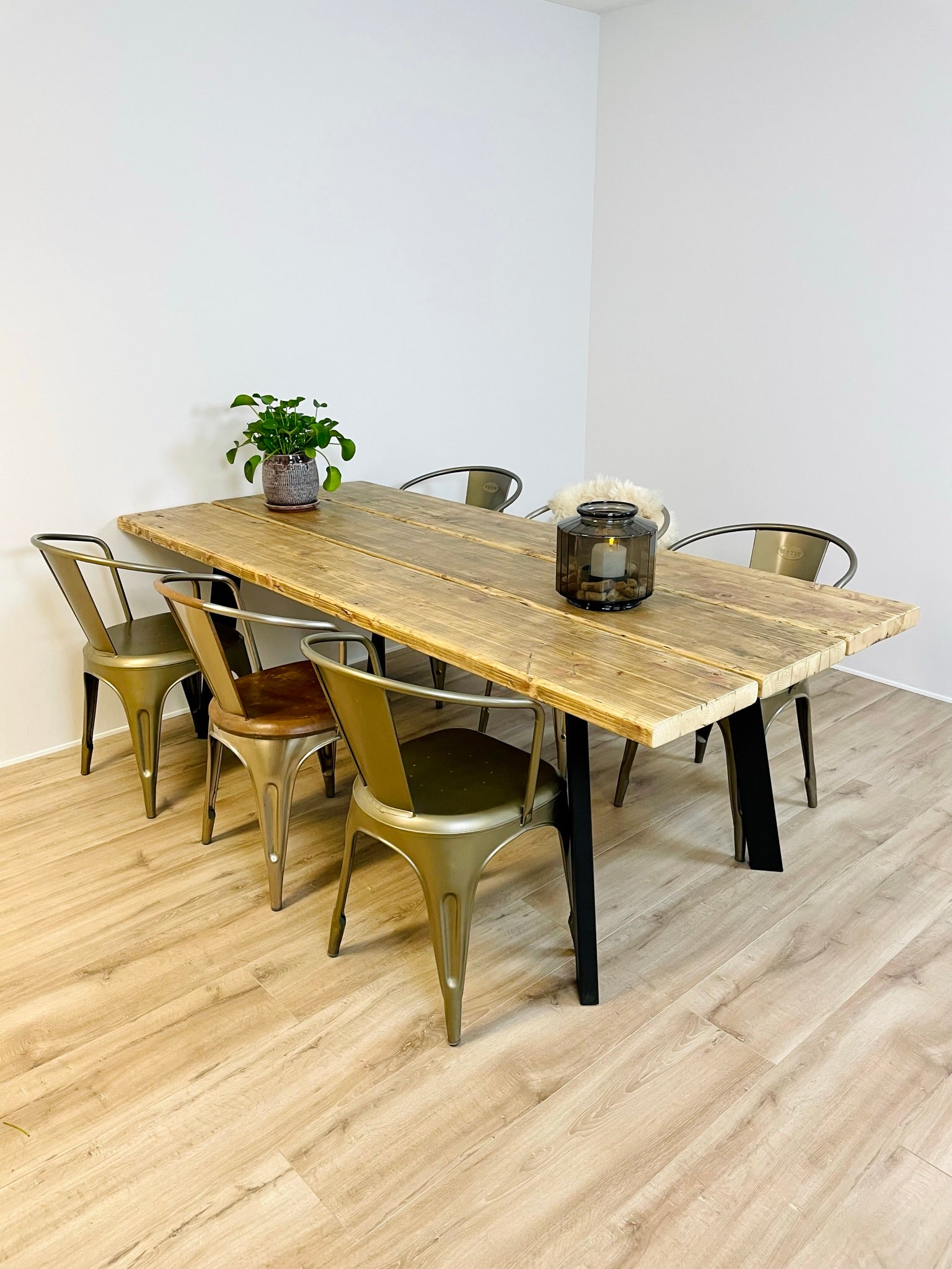 Plankebord af Genbrugsplanker | Sort Stålstel | 180 cm / Brændt og Lakeret
