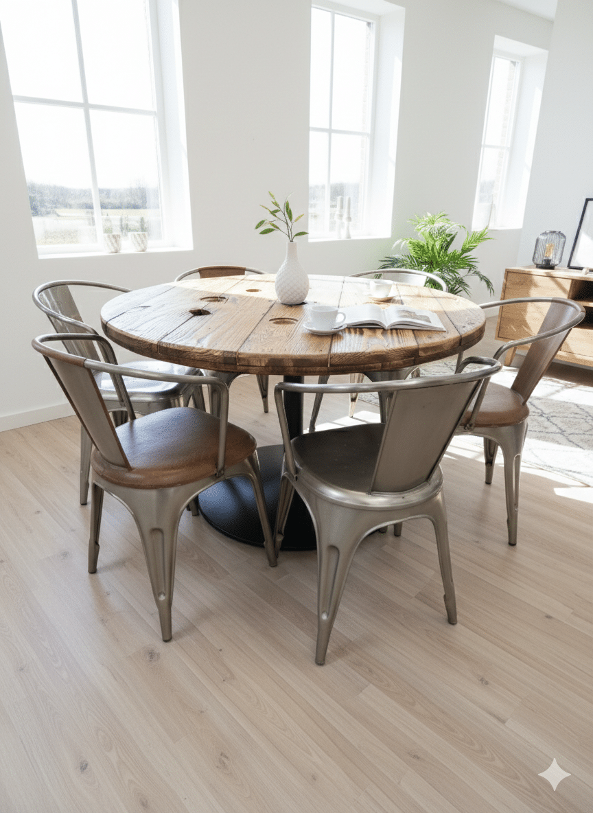 Giv dit hjem karakter med et unikt spisebord skabt af autentiske kabeltromler fra den danske byggeindustri. En perfekt fusion af industrielt genbrugstræ og minimalistisk centerstel. Leder du efter et spisebord, der ikke bare er et møbel, men en samtalesta
